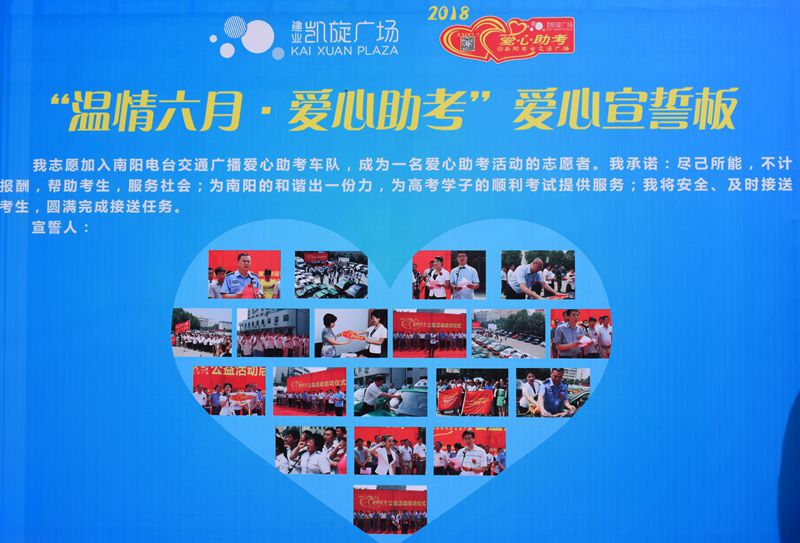 6月1日,由南阳市文明办、市教育局、市公安局交警管理支队、市运管局、南阳人民广播电台交通广播、南都晨报社联合主办的南阳市第十二届“温情六月·爱心助考”大型公益活动启动仪式在建业凯旋广场成功举行。今年的“爱心助考”活动再次启动,目前,已有1000多台车辆加入到爱心助考行列中来,继续为高考考生保驾护航。