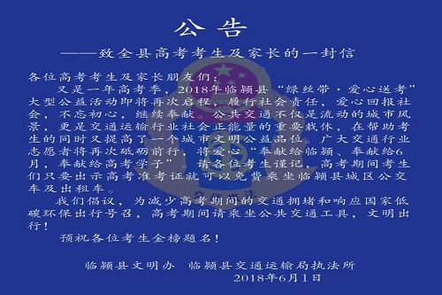 通过举办本次活动,进一步弘扬志愿服务和爱心奉献精神,积极履行交通运输行业的社会责任和义务,充分体现临颍人的团结友爱,互帮互助,对社会高度负责的生活态度,共同创建一个文明进步、交通和谐、关心关爱的高考人文环境,用“大爱无疆”的和谐音符谱写“文明临颍、生态临颍”的精彩篇章,为建设经济繁荣、社会和谐、民生殷实、生态优美的新临颍做出积极贡献。