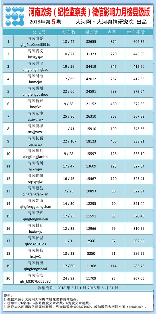 该榜单由大河网大河舆情研究院制作,监测对象覆盖了河南省境内较为活跃的政务(纪检监察类)微信公号,监测周期为2018年5月1日至31日。如您有意推进智慧政务建设,或有意自荐将您所属政务(纪检监察类)微信公号列入监测范围,请致电大河网客服电话:400-637-1669。(杨慧俊 谢珊 熊孟元)