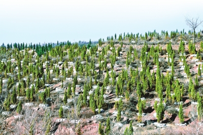 当时济源新修成了石寺路,路两侧尽是大片的红色石头山地,这里成为“困难地”造林的试验田。