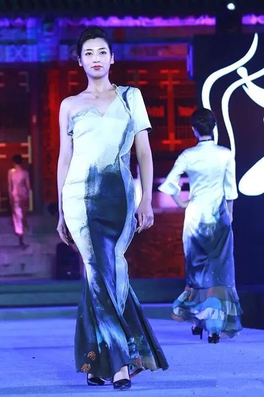 晚上的大秀分为三个系列,中间用诗文串起不同系列的写意空间,也是对服饰的文化内涵的阐述与外延。第一个系列把中国徽派建筑之美,利用马头墙等元素把徽州风景之灵气与中国风俗文化之精华,通过服装结构造型来呈现。第二系列的江南墨彩,用写意的笔触和不同材质的混搭,极显中国女性之柔美,尤其应和室外景象,风动影移。第三系列用浓墨重彩渲染了传统文化在时尚现代剪裁下,极具国际化语言的表达,更能看到传统文化的现代演绎和实用主义。