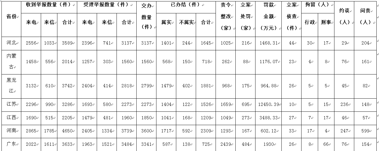 记者了解到,截至6月25日晚8点,6个督察组共收到群众举报29245件,受理有效举报24246件,经梳理合并重复举报,累计向被督察地方转办交办23087件;各被督察地方完成查处12409件,其中立案处罚2579家,罚款25096万元;立案侦查208件,拘留235人;约谈1065人,问责1939人。