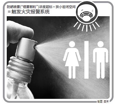 火灾报警的信息定位于列车3车厢的卫生间,当随车机械师走近该车厢卫生间时,先闻到一股浓烈的香味。打开门后,香味扑鼻,一位女乘客携带着一瓶防晒喷雾走出来。