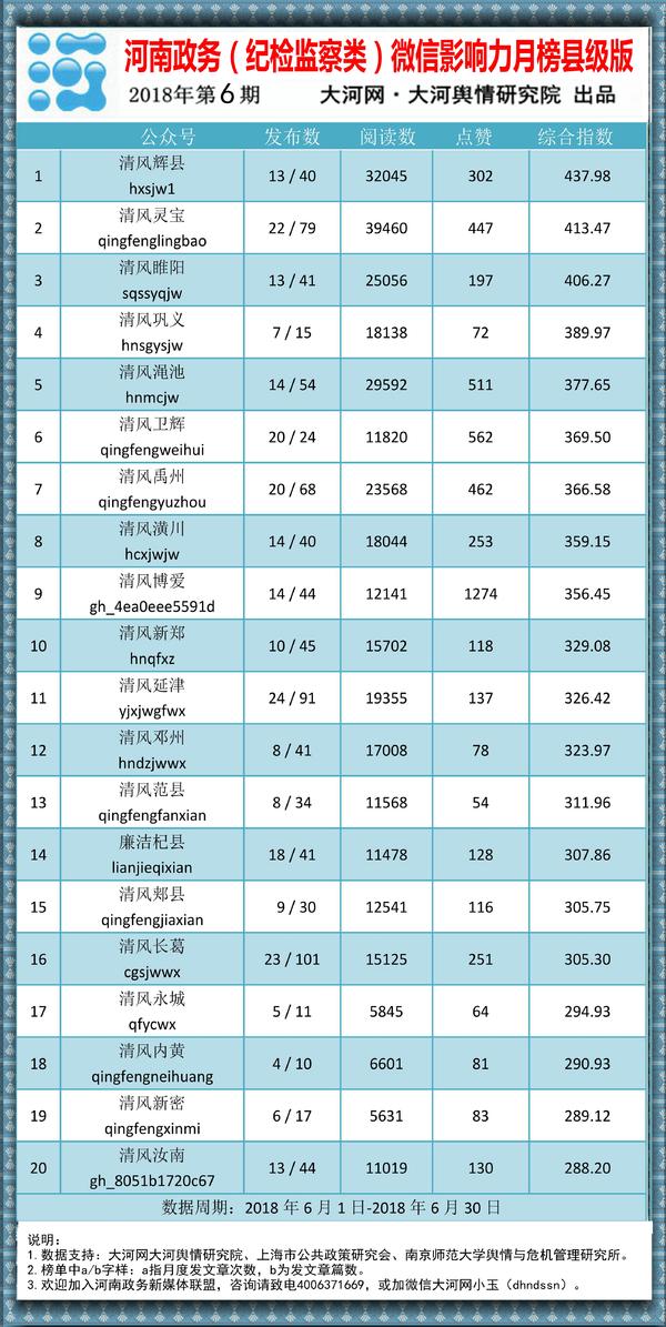 河南政务(纪检监察类)微信影响力月榜2018年度第6期20强全名单依次为:清风中原、清风莲城、清风信阳、清风郑州、清风商丘、清风洛阳、廉洁漯河、清风焦作、清风南阳、清风鹤壁、清风开封、清风平顶山、清风三门峡、清风驻马店、清风辉县、清风灵宝、清风龙都、清风睢阳、清风巩义、清风济源。
