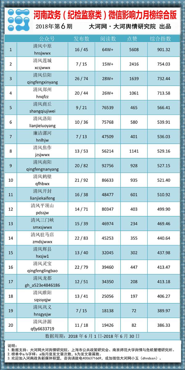 该榜单由大河网大河舆情研究院制作,监测对象覆盖了河南省境内较为活跃的政务(纪检监察类)微信,监测周期为2018年6月1日至30日。如您有意推进智慧政务建设,或有意自荐将您所属政务(纪检监察类)微信公号列入监测范围,请致电大河网客服电话:400-637-1669。(詹婷)