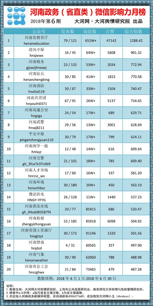 该榜单由大河网大河舆情研究院制作,监测对象覆盖了河南省境内较为活跃的政务(省直类)微信公号,监测周期为2018年6月1日至30日。如您有意推进智慧政务建设,或有意自荐将您所属政务(省直类)微信公号列入监测范围,请致电大河网客服电话:400-637-1669。(熊孟元)