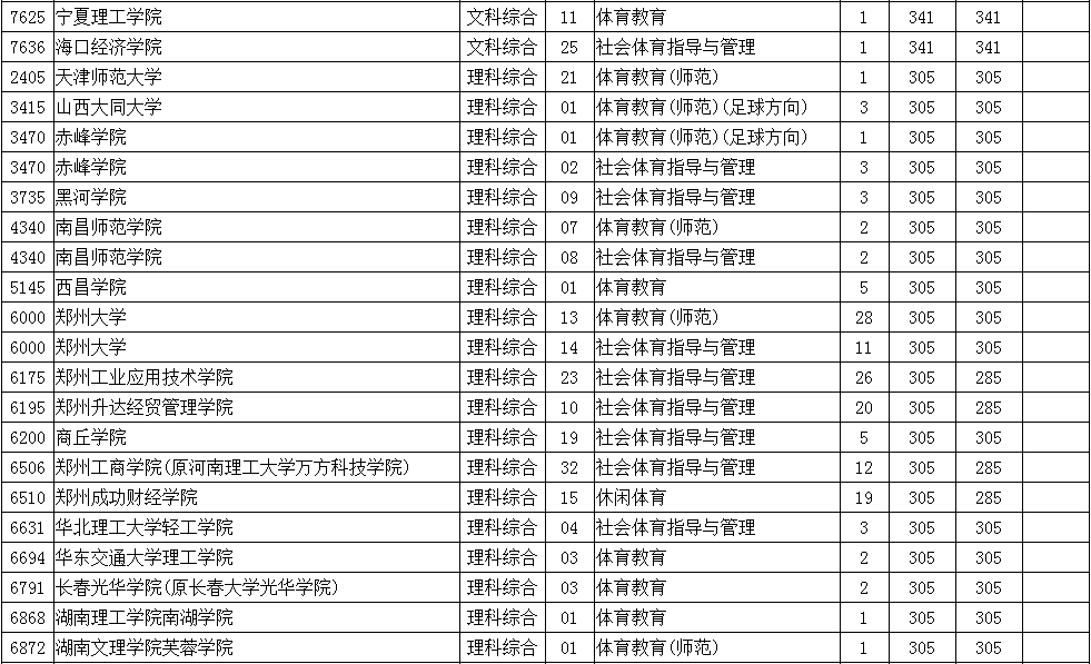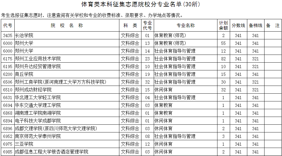 凡高考成绩和专业考试成绩达到体育类本科录取控制线,目前未被任何院校录取的体育类考生,均可补报。其中,郑州工业应用技术学院、郑州升达经贸管理学院、郑州工商学院(原河南理工大学万方科技学院)3所院校降20分备档征集。