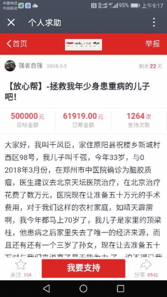 4月初,原阳一家网络科技公司开发的“放心帮”APP开始为千强发起网络募捐。短短一周时间,捐款额达到了6万多元。
