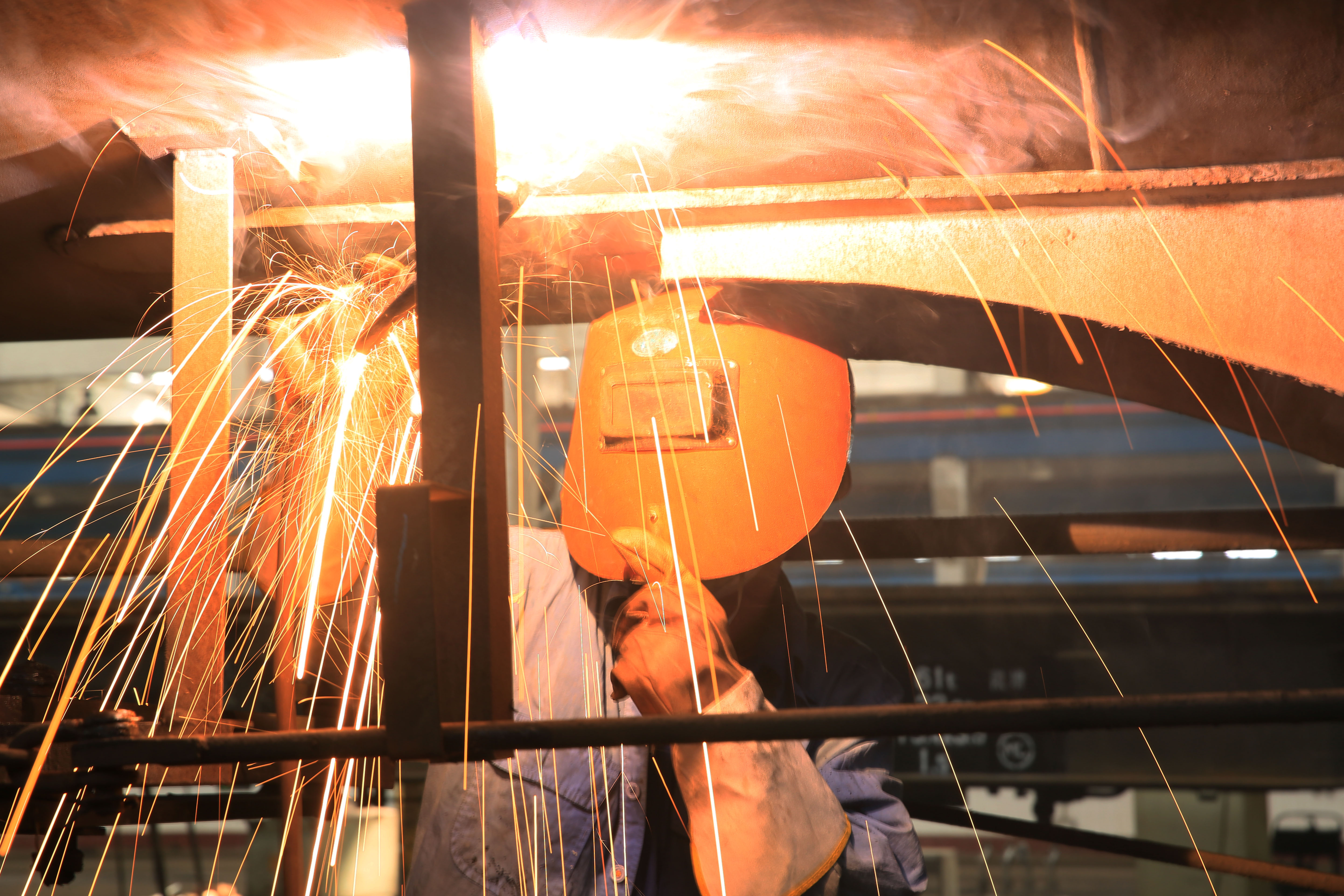 头顶是交错往来的天车,耳中是不间断的110分贝以上的机器运行声,熔接工们跻身在车辆狭小的空间中,为病害货车操刀“手术”,手中的焊钳夹着焊条与车体接触的瞬间,花火迸发,热浪蒸腾,此刻,墙上的温度计显示,修车大库中的室温已经直逼42℃,而头戴安全帽、防护面罩、防尘口罩,身着双层工作服、长及手臂的帆布手套和反绒面工作鞋的熔接工们感受到的温度,可想而知。
