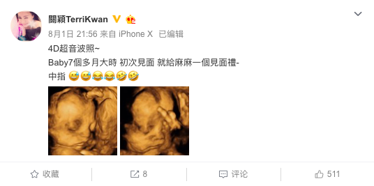 关颖在网上晒出一组三胎儿子的B超照,并配文称:“4D超音波照~Baby7个多月大时, 初次见面 ,就给妈妈一个见面礼-中指。”言语里充满了再为人母的喜悦之情。