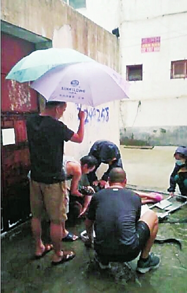 8月4日凌晨,众人撑伞救护一名晕倒的女子。