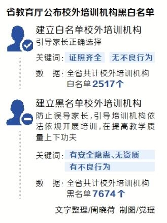 我省6月份启动了校外培训机构专项治理,向“无证无照”“超纲教学”等种种乱象亮剑。8月14日,我省公布了首批“证照齐全”和无不良行为的校外培训机构白名单2517个,有安全隐患、无资质和有不良行为的校外培训机构黑名单7674个。