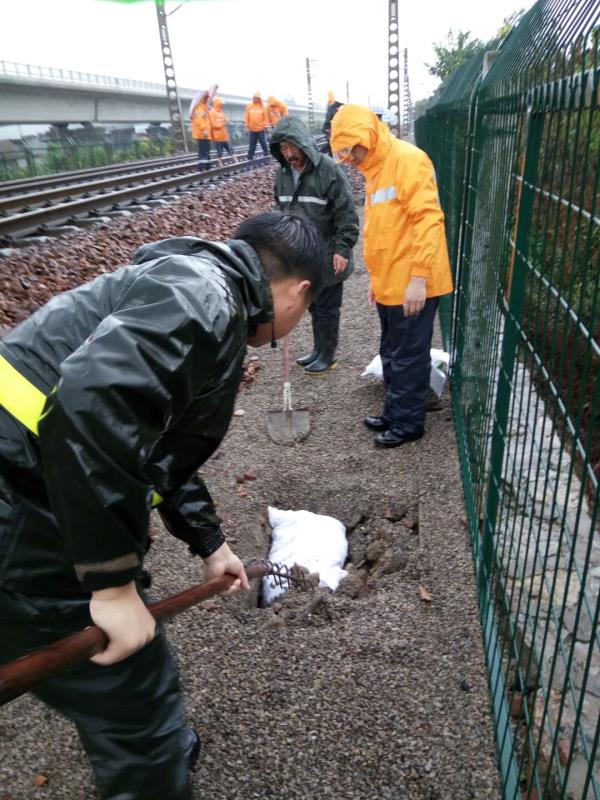 中国铁路郑州局集团有限公司紧急启动Ⅲ级降雨应急响应,集团公司领导到调度台盯岗并现场指挥抢险,工务、电务、供电、机务、运输、客运、房建、建管等系统、单位主要领导班子成员全员上岗,降雨区段包保领导、包保干部做好现场检查、指导工作,抢险材料、机具处于待命状态,随时出动。中国铁路郑州局集团有限公司近千名干部职工冒雨深入水害现场,加大对线路、供电、接触网、信号等设备的检查、抢修力度。对受损严重的路基地段打入角钢桩,并用片石等抢险材料对受损的道床和路肩根基进行了加固,对受水害影响限速运行的区段实行双班24小时巡查,时刻监测水害变化,遇到险情不明时,坚决贯彻“先防护后处理”的原则,宁可错拦,不可错放,确保列车绝对安全。