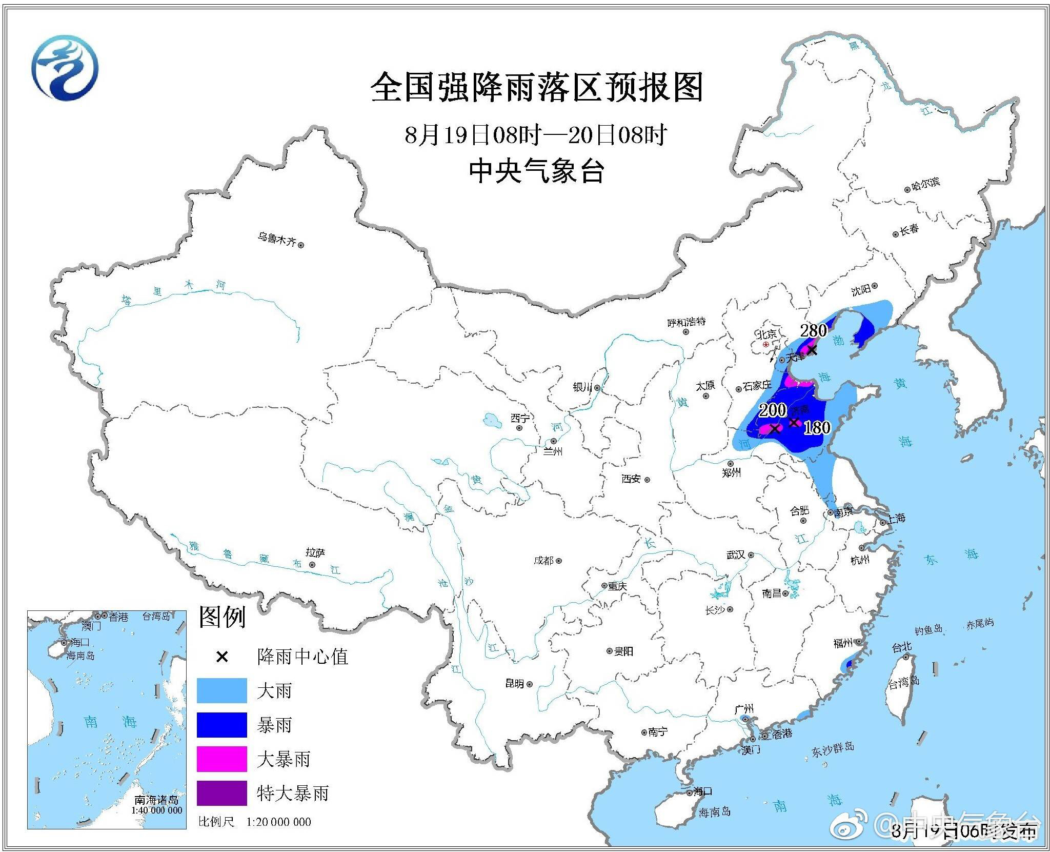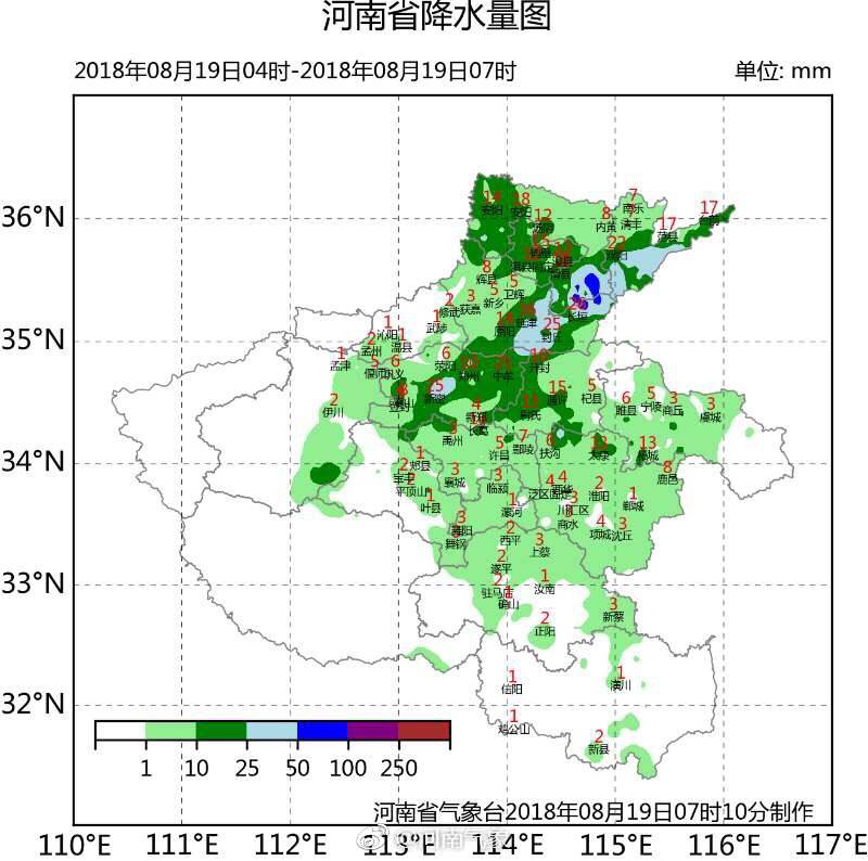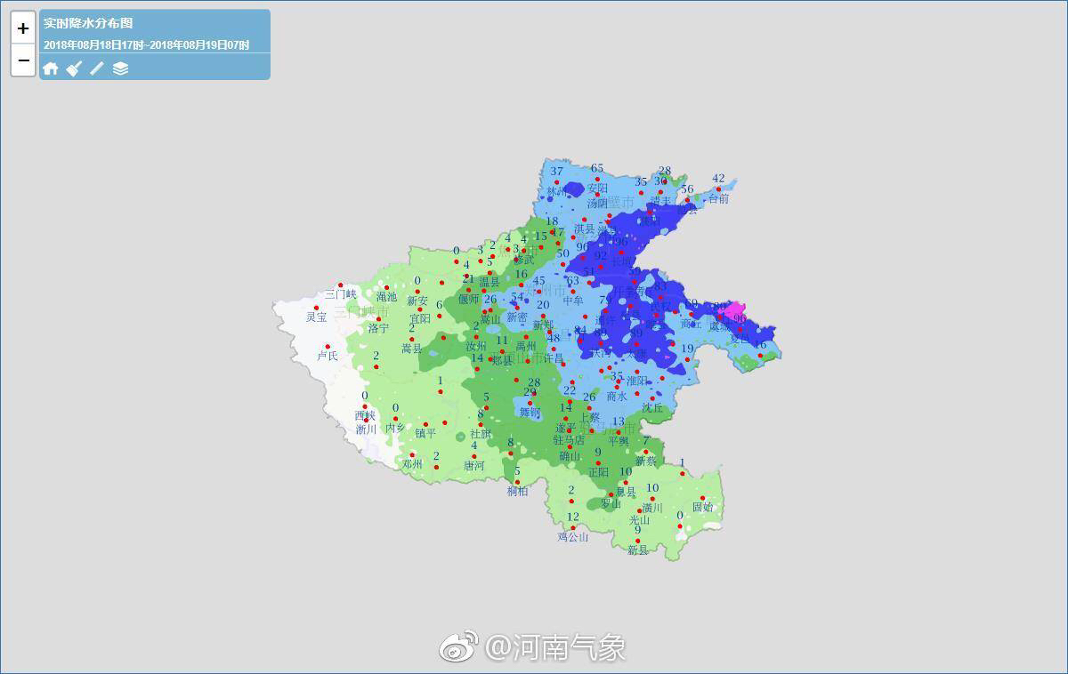 目前较大降雨区已有所北移,19日04时至07时,安阳市、新乡市局地出现暴雨,濮阳市、商丘市、郑州市、周口市局地出现大雨。地市平均降水量前三位依次为濮阳市15.8毫米、安阳市15.5毫米、新乡市14.2毫米。