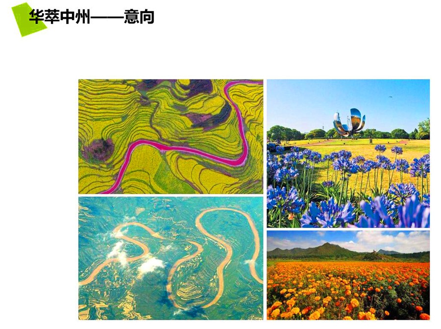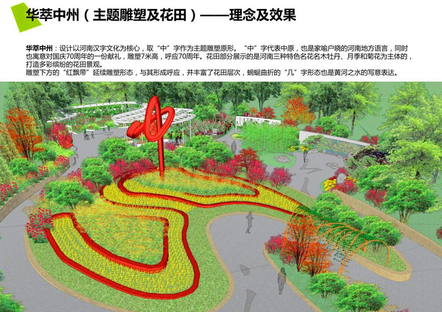 华萃中州,设计以河南汉字文化为核心,取“中”字作为主体雕塑原形。“中”字代表中原、中州,也是家喻户晓的河南地方语言,同时也寓意对国庆70周年的一份献礼。雕塑7米高,呼应70周年。花田部分展示的是以河南特色名花名木牡丹、月季和菊花等为主体的缤纷花田景观。
