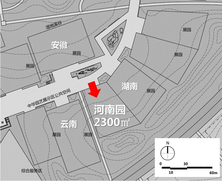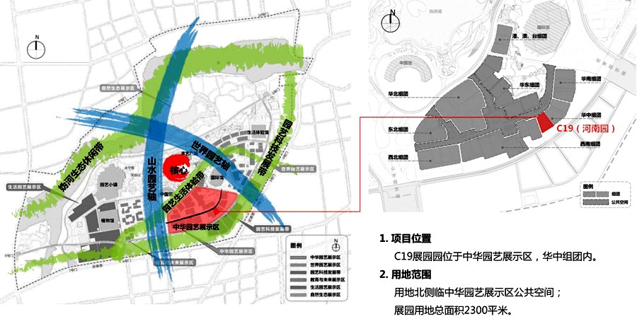 看看下面这张图,大致了解河南展区的大体位置。图中,左侧是整个园区示意图;右侧是中华园艺展示区示意图。河南展区,当然就在中华园艺展示区里。留意右侧c19指示的红色色块,那里就是我们河南展区。