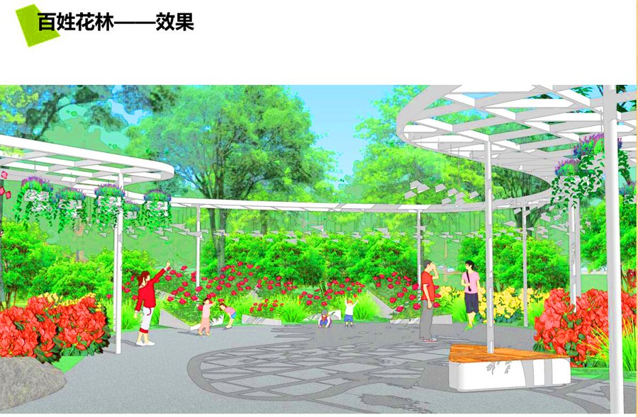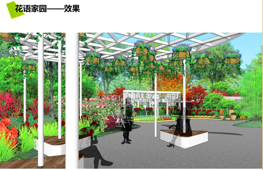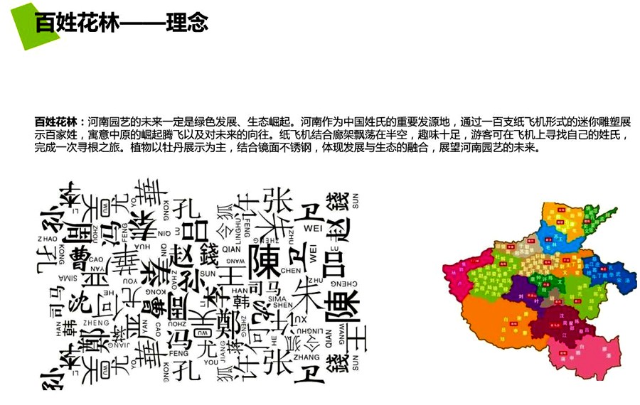 百姓花林,河南园艺的未来一定是绿色发展、生态崛起。河南作为中国姓氏的重要发源地,通过一百个金属迷你飞机雕塑来展示百家姓,寓意中原的崛起腾飞以及对未来的向往。迷你飞机结合廊架飘荡在半空,游客可在飞机上寻找自己的姓氏,完成一次寻根之旅。植物以牡丹为主,体现发展与生态的融合,展望河南园艺的未来。
