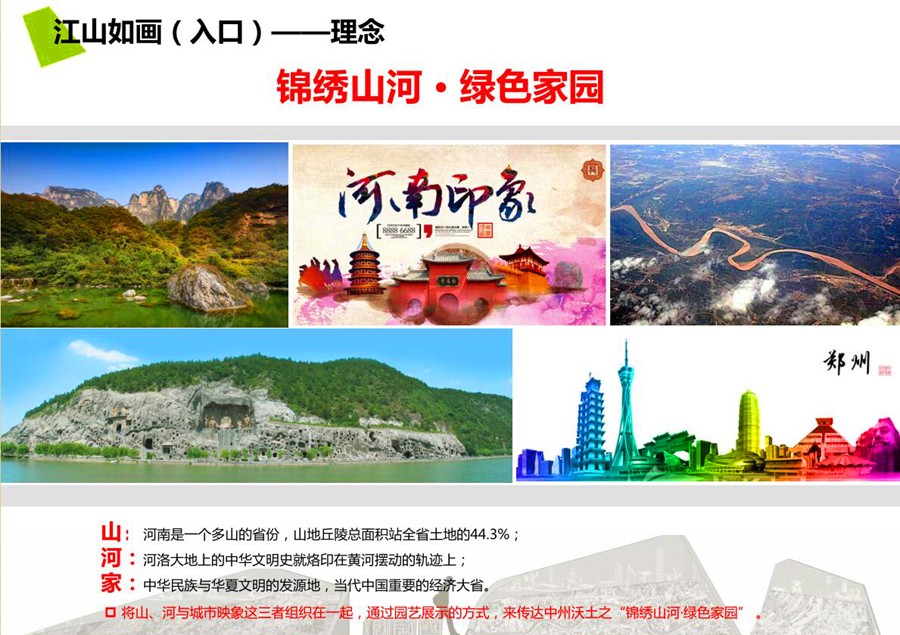 景点布置方面,结合游赏特点,形成河南展园特色八景。这八景分别是江山如画、华萃中州、花影廊道、九曲花河、艮岳花艺、花语家园、百姓花林、逐水飞花这八个均含“花”字谐音之景。