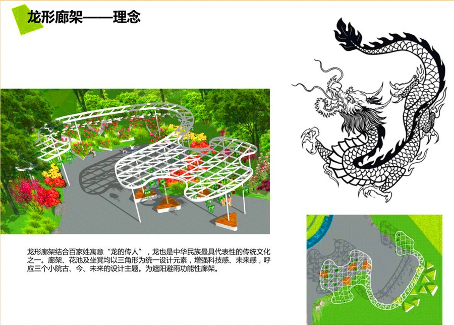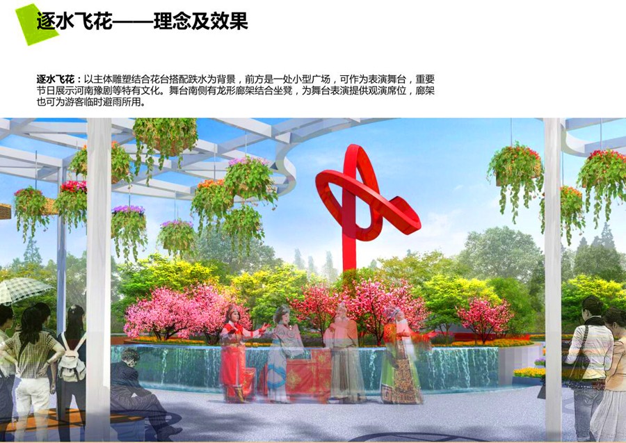 逐水飞花,以主体雕塑结合花台搭配跌水为背景,前方是一处小型广场,可作为表演舞台,重要节日展示河南豫剧等特有文化。舞台南侧有龙形廊架结合坐登,为舞台表演提供观演席位,廊架也可为游客临时避雨所用。