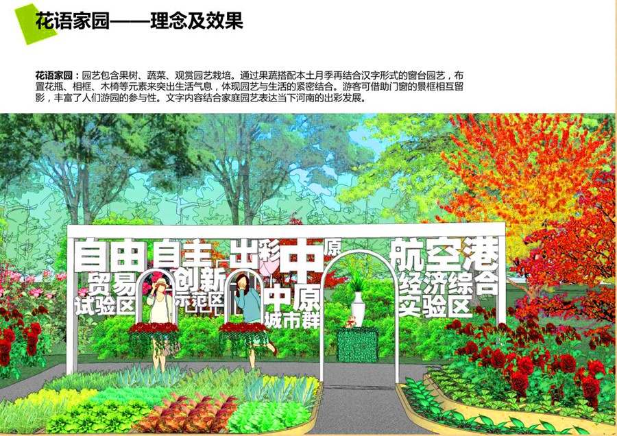 花语家园,园艺包含果树、蔬菜、观赏园艺栽培。通过果蔬搭配本土月季再结合汉字形式的窗台园艺,布置花瓶、相框、木椅等元素突出生活气息,体现园艺与生活的紧密结合。游客可借助门窗的景框相互留影,丰富了人们游园的参与性。文字内容结合家庭园艺表达当下河南的出彩发展。