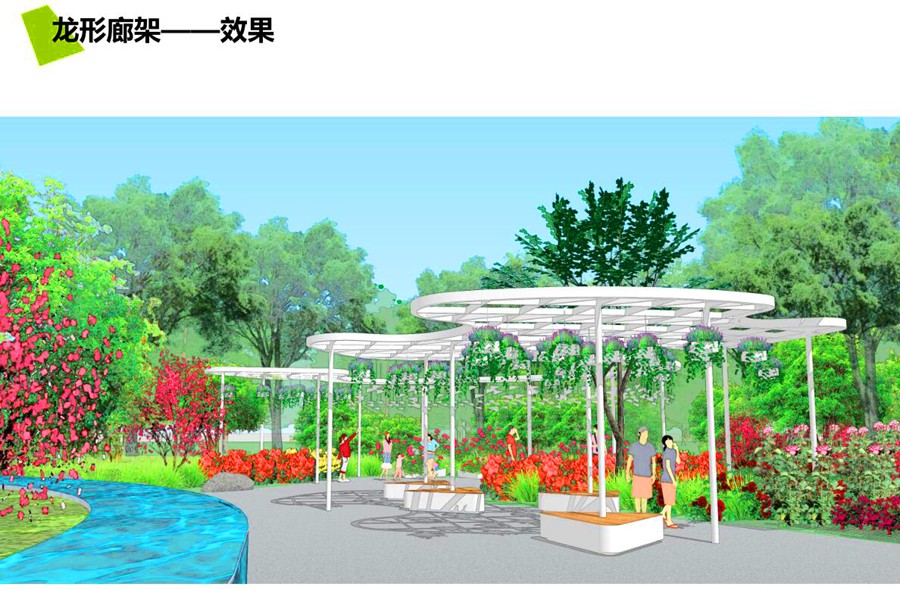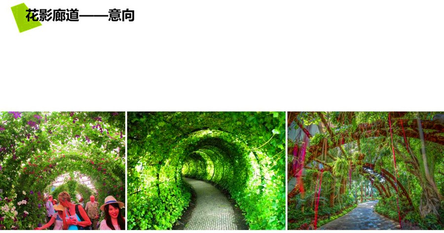 花影廊道,运用藤本植物与钢、木结合,游客穿越花廊,感受多种空间变换下的乐趣,激发人们的游览热情和对园艺生活的思考。
