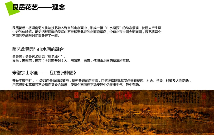 艮岳花艺,将河南菊文化与技艺融入自然山水画中,形成“山水菊园”的动态景观,使游人产生画中游的体验感。历史记载河南的艮岳山石被移至北京的北海琼华岛,今有北京世园会河南园,园艺将两个不同的空间与时间重叠在了一起。