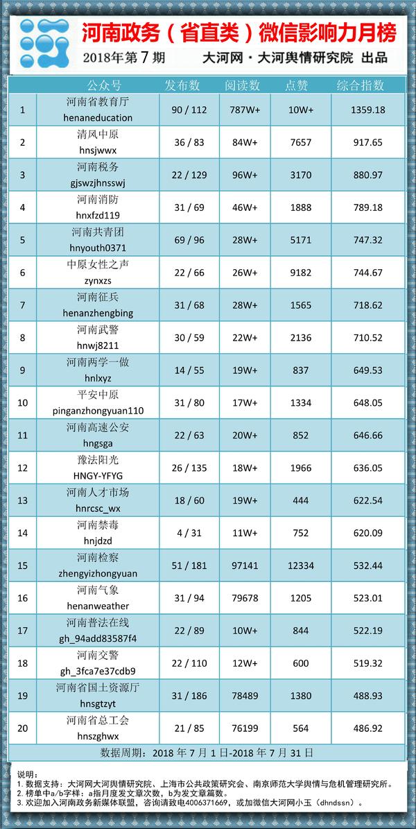 该榜单由大河网大河舆情研究院制作,监测对象覆盖了河南省境内较为活跃的政务(省直类)微信公号,监测周期为2018年7月1日至31日。如您有意推进智慧政务建设,或有意自荐将您所属政务(省直类)微信公号列入监测范围,请致电大河网客服电话:400-637-1669。(熊孟元)