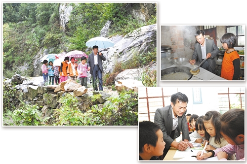 左图:放学了,张玉滚送学生们回家。右上图:张玉滚为学生们做好了饭菜。右下图 课下,张玉滚指导学生们写作业。(资料图片)
