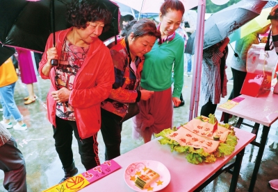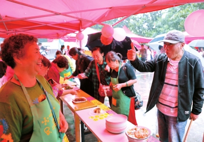 18日一大早,天虽下着小雨,但大家热情很高。70余名居民把刚做好的拿手菜,从家里端了出来,摆放在活动现场的桌子上。红烧野生鲫鱼、蓝莓果酱、五彩饺子、咖喱牛肉、宫保鸡丁、江米切糕、蒸发糕、珍珠丸子、八宝饭……琳琅满目的美食,让人垂涎欲滴。