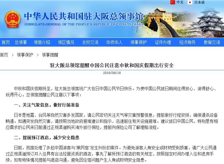 中新网9月19日电 据中国驻日本大阪总领馆网站消息,中秋和国庆假期将至,驻大阪总领馆提醒中国公民通过正规渠道预订并入住具有合法经营资质的酒店,避免因住宿问题产生人身或财物安全隐患。