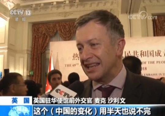 英国驻华使馆前外交官 麦克·沙利文:这个(中国的变化)用半天也说不完。我第一次到中国是1982年,改革开放刚开始,那时候我们根本没有想到现在中国会成为那么成功的国家,那么繁荣的国家,影响那么大的国家。(上世纪)八十年代,中国人、外国人我们都没有想象会成为这样。向你们69年来取得的伟大成就表示祝贺。