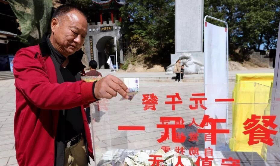 国庆长假期间,老君山中天门广场上的"一元午餐"摊点成为该景区抢眼的"景观",游客们排成长龙,等待开餐。记者看到,摊点一旁的提示牌上写着"1元午餐,无人值守,自觉投币,自助找零"。整个过程无人收款,无人监管,也无人找零,完全靠游客自觉将钱币投到收款箱里后取饭。经统计,10月1日当天,共卖出1200碗午餐,收入为1275元,还多出了75元。