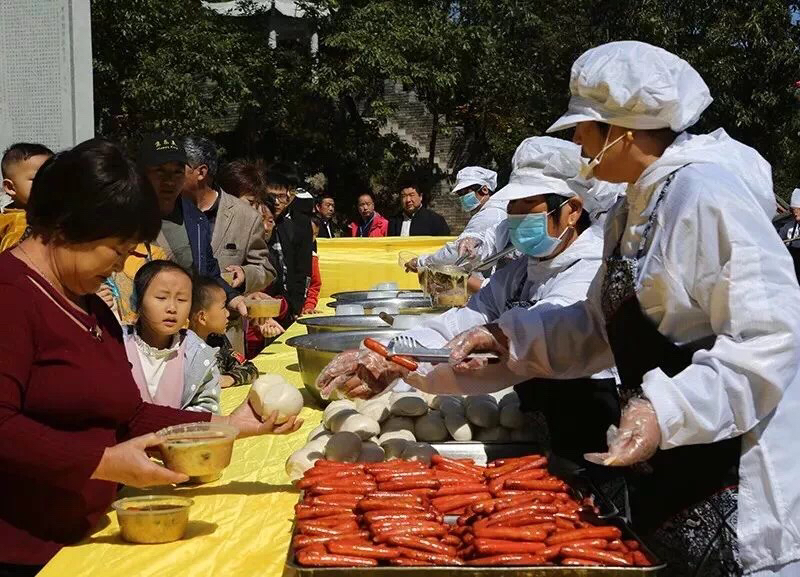 活动现场,四口热腾腾的面条锅,饭香扑面而来。游客投完钱后,排队领取一碗当地特色糁汤面、一根香肠和一个馒头。
