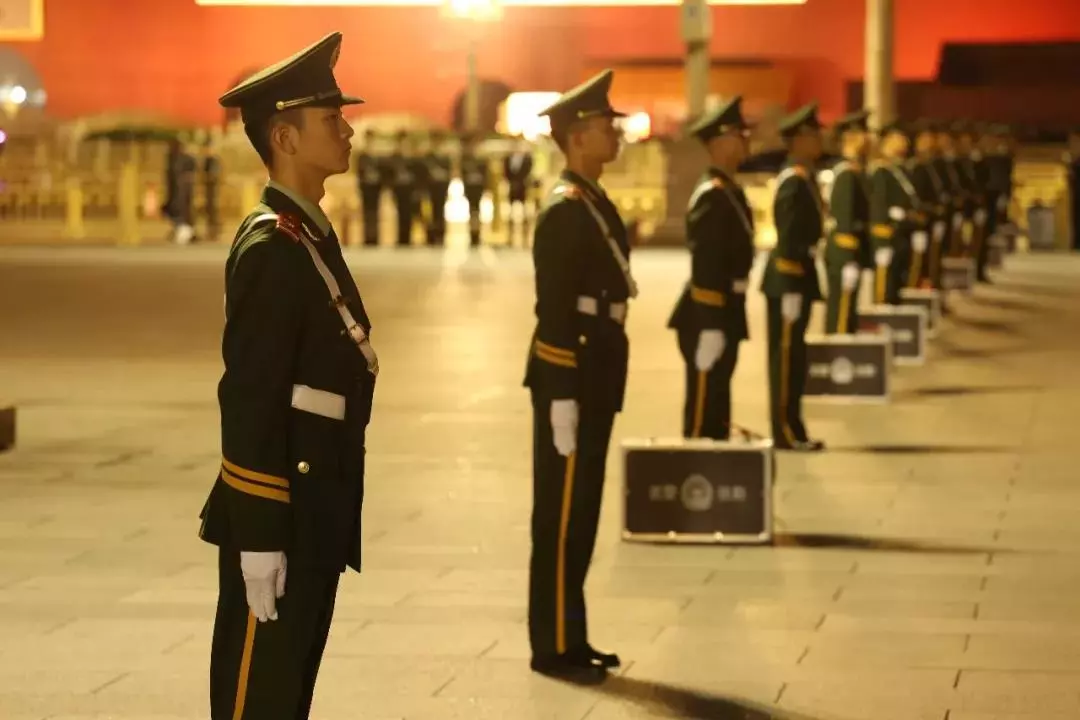 10月1日,天安门,清晨,武警官兵们来到天安门广场维护秩序。