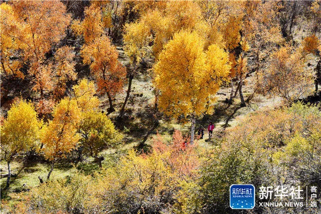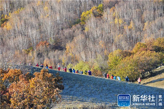 10月2日,游人在位于内蒙古巴彦淖尔市乌拉特前旗的大桦背欣赏秋景。新华社发(支茂盛 摄)