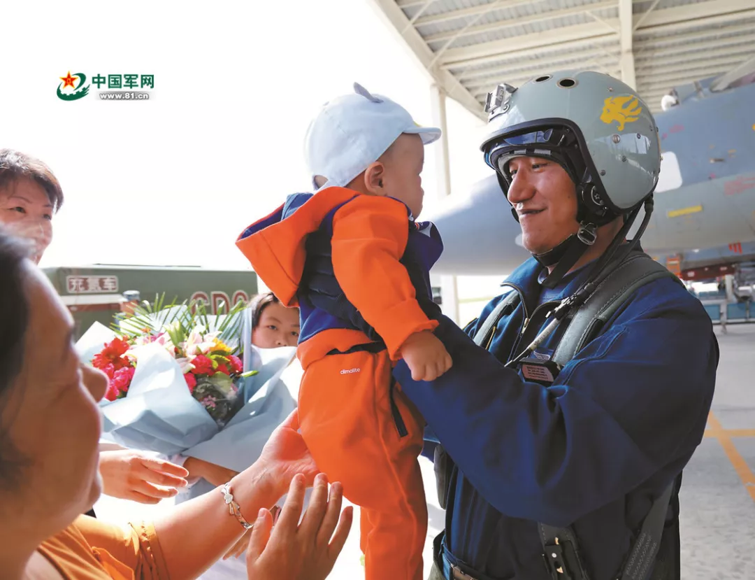 西部战区空军航空兵某旅一级飞行员张庆生(右一)执行任务归建,刚下飞机就见到前来迎接的家人。接过不满一岁的儿子张楚昱(右二),张庆生将其高高举起,一家人脸上洋溢着幸福的笑容。席博博、王世莹摄影报道