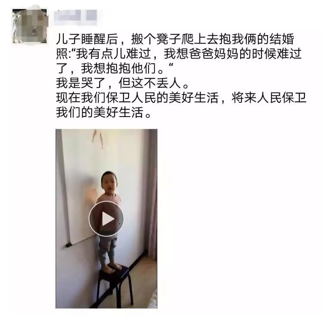 他的儿子睡醒后,搬了个凳子爬上去抱他们的结婚照,说自己有点儿难过:“我想爸爸妈妈的时候难过了,我想抱抱他们。”