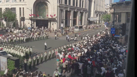 在上海南京路,帅气的“武警人墙”今年依旧成为了国庆的热点话题。武警战士列队用身体形成了“人墙”,保障车辆人流有序通行。