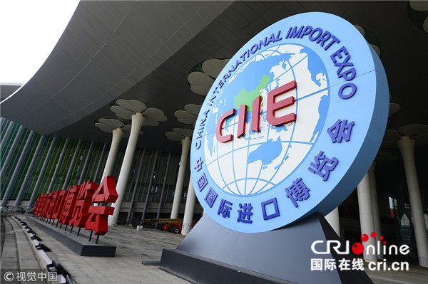 上海国家会展中心首届中国国际进口博览会现场,各国国旗、博览会会旗迎风招展,展会各项准备工作就绪。