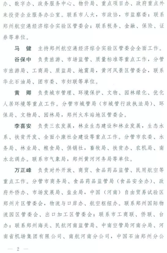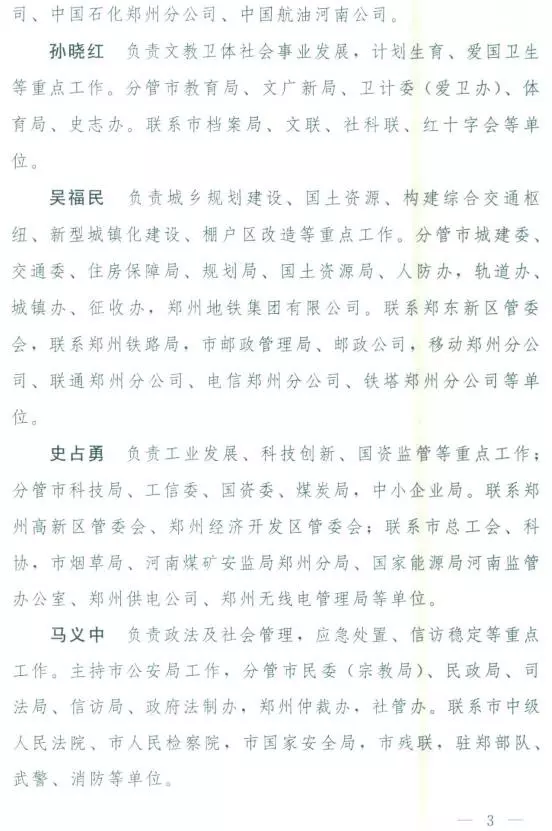 分管市政府办公厅,市编办、发展改革委、财政局、人社局、审计局、统计局、安监局、公积金中心,金融办、数字办、政务服务中心、物价局、重点项目办、政府重点外来投资企业服务办公室。联系市人大,市政协,市监察委;联系郑州航空港经济综合实验区管委会;联系税务、金融、保险、证券等单位。