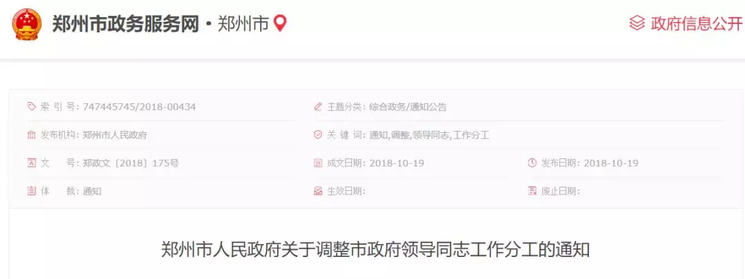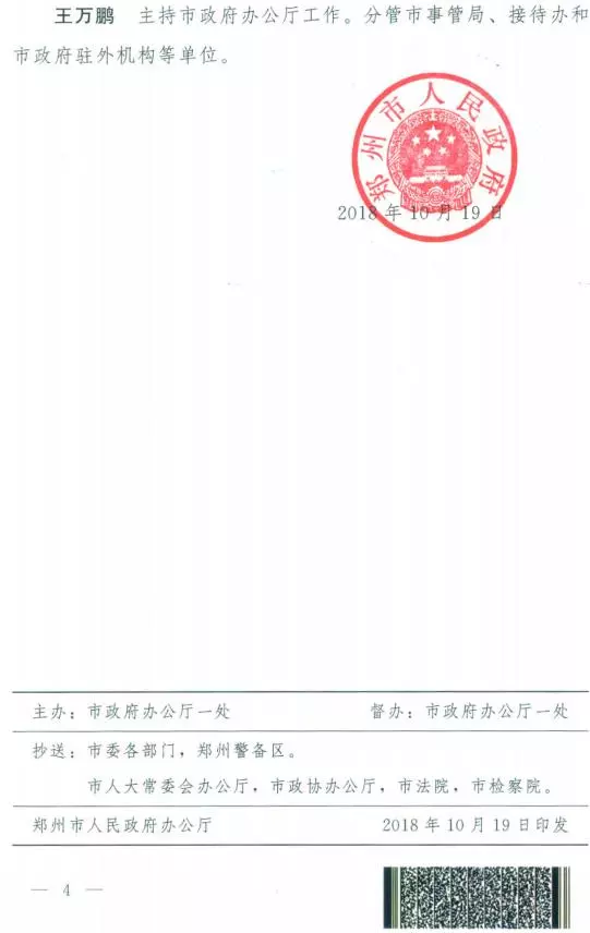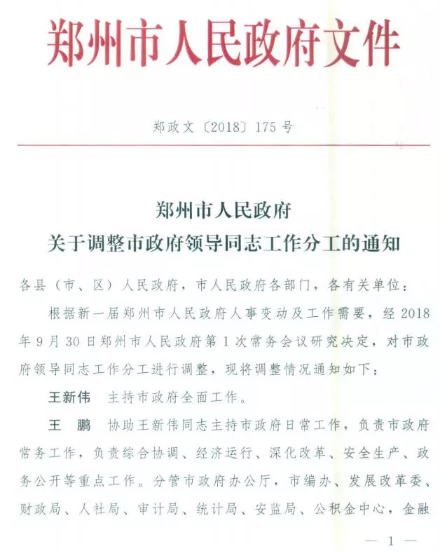 在9月举行的郑州市第十五届人民代表大会第一次会议第三次全体会议上,王新伟当选为郑州市人民政府市长,王鹏、谷保中、黄卿、李喜安、万正峰、孙晓红、吴福民、史占勇、马义中当选郑州市人民政府副市长。10月19日,郑州市人民政府官网发布《郑州市人民政府关于调整市政府领导同志工作分工的通知》,明确了郑州市政府领导同志的最新工作分工。