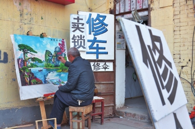 在洛阳西工区纱厂东路和解放路交叉口西南角,一间小小的自行车修车店门口,一位皮肤黝黑、农民打扮的师傅正在修自行车,而他的店门口却支着一个画架,地上散落着颜料和画笔,画板上面的水粉画即将完工。难道这幅画是出自这位修车师傅之手?