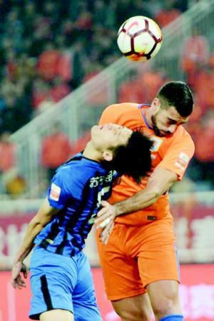 更让泰山队球迷兴奋的是,在苏宁队很快由特谢拉扳平比分的情况下,泰山队没有被丢球打垮,而是立即发起了反扑。下半场比赛刚开始不久,泰山队利用定位球机会再次反超比分。蒿俊闵送出过顶球,苏宁队后防线出现防守失误,吉尔轻松推射破门,值得一提的是,吉尔完成的是穿裆破门。