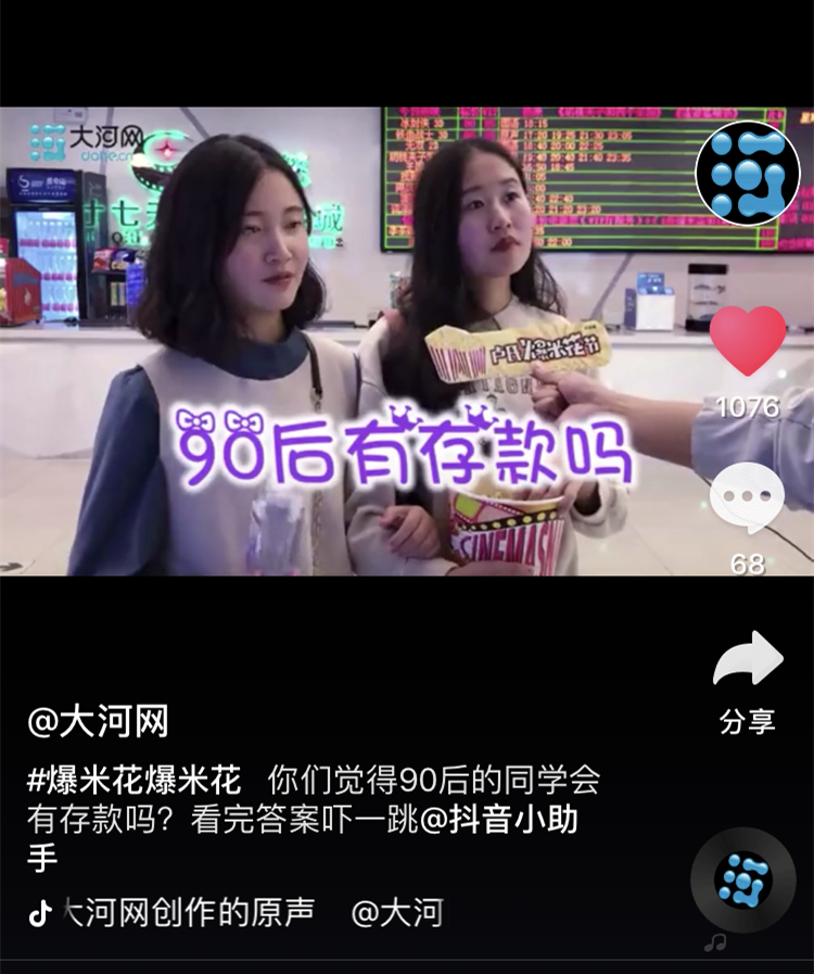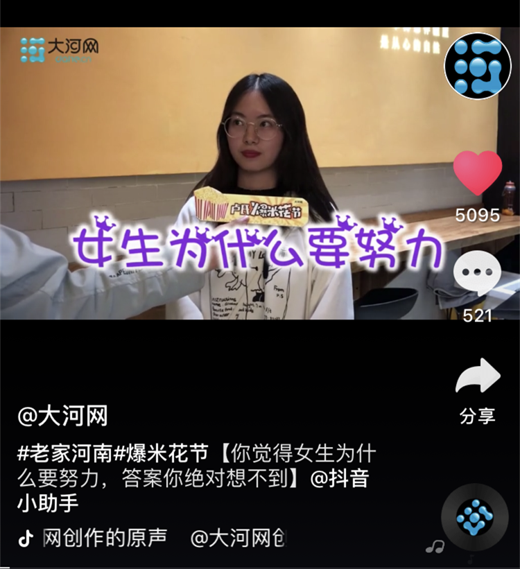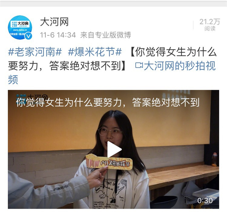 原因一:老家河南·卢氏首届爆米花节系列短视频聚焦青年热点话题,与爆米花紧密结合,既吸引民众关注,又巧妙引导受众关注“爆米花”节。如短视频《你觉得90后是否有存款》、《你认为女生是否应该更坚强》、《关于爆米花你都知道些啥》等作品。