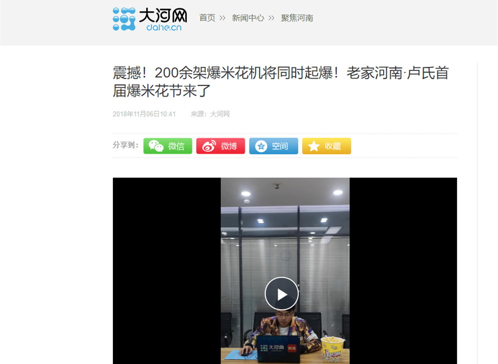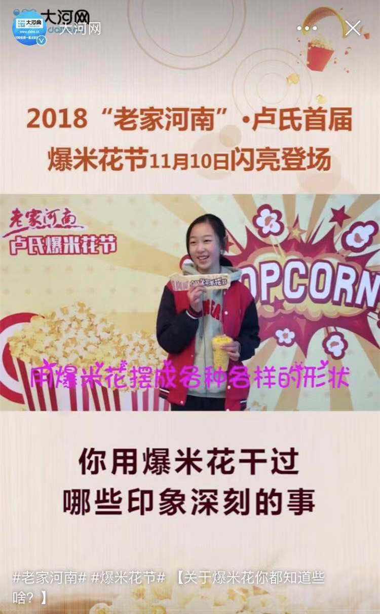 原因二:大河网通过新闻、短视频、自宣图、直播、网络话题炒作等多手段,大河网PC端、APP端、大河网官方微博、头条号、抖音等全媒体渠道分发卢氏爆米花节预热宣传资讯,力促“爆米花”节引爆网络。
