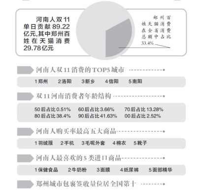 据菜鸟网络提供的数据显示:河南省的包裹量位居全国第六,双11当日全天发货量和全天签收量排名全国第十;郑州城市包裹签收量位居全国第十、河南第一,洛阳、新乡则紧随其后。