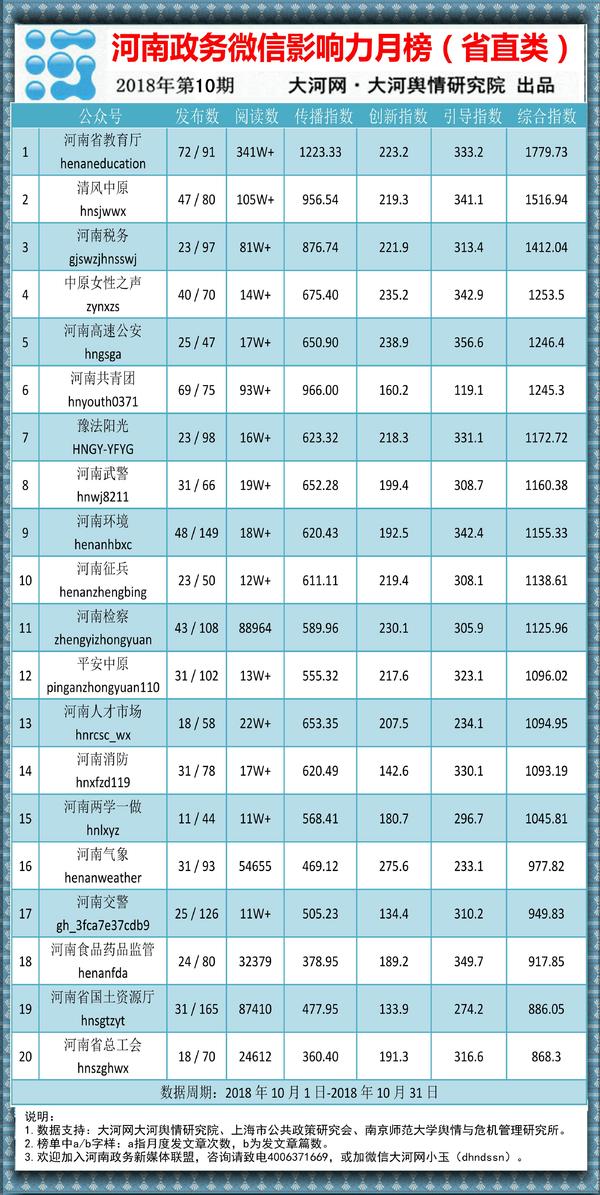 该榜单由大河网络传媒集团政务运维中心、大河网大河舆情研究院联合制作,监测对象覆盖了河南省境内较为活跃的政务微信公号(省直类),监测周期为2018年10月1日至31日。如您有意推进智慧政务建设,或有意自荐将您所属政务微信公号(省直类)列入监测范围,请致电大河网客服电话:400-637-1669。(詹婷 孙轲轲)