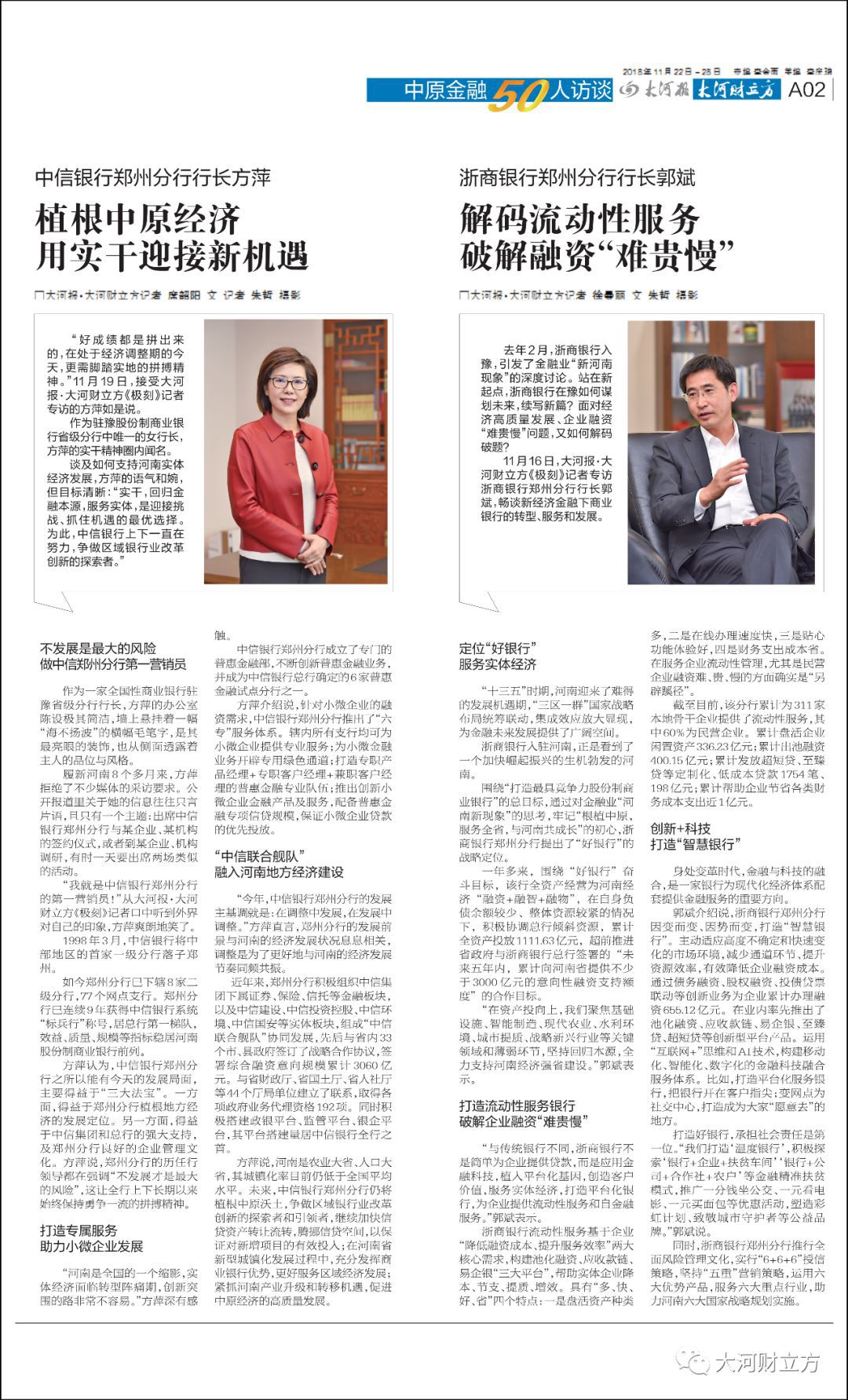 “当前经济运行稳中有变,经济下行压力有所加大,部分企业经营困难较多,长期积累的风险隐患有所暴露,我国经济正在由高速增长阶段转向高质量发展阶段。大家共同身处其中,这也是考验金融机构综合能力、应对能力、担当能力的时候。”谈及如何扎根中原沃土,支持河南实体经济的发展,方萍的语气和婉,但目标清晰:“实干,回归本源,服务实体,是迎接挑战、抓住机遇的最优选择。为此,中信银行郑州分行上下一直在努力,争做区域银行业改革创新的探索者。”