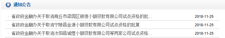 公告显示,根据《河南省人民政府办公厅关于开展小额贷款公司试点工作的意见》,经研究,省金融办同意洛阳市政府金融办《关于取消汝阳县诚煜小额贷款有限公司等两家公司试点资格的请示》、商丘市政府金融办《关于取消宁陵县金源小额贷款有限公司试点资格的请示》和《关于取消商丘市梁园区银信小额贷款有限公司试点资格的请示》。
