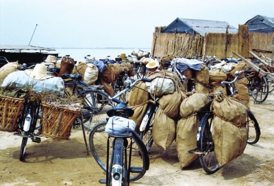 黄色的河,被誉为中国的母亲河,黄河流域被认为是中华文明的摇篮。实际上,过去的很多朝代都是在黄河流域诞生的:汉朝、唐朝、北魏、宋朝。围绕着黄河也诞生了很多都城:咸阳、长安、洛阳、汴京。凶猛激烈的黄河水和它变幻莫测的水性“造就”了中国,直至20世纪50年代,黄河才被人类驯服,人类的治理减弱了它汹涌奔腾的生命特征。现在我们在位于开封以北几公里处的黄河渡口,一辆辆超载的自行车正在等渡船把它们带到黄河北岸。这也是一张应该存入档案的老照片。